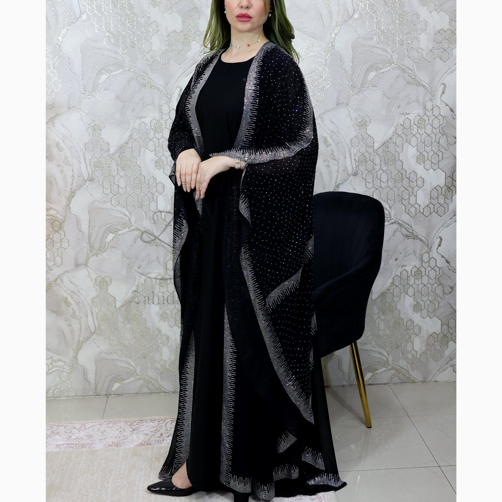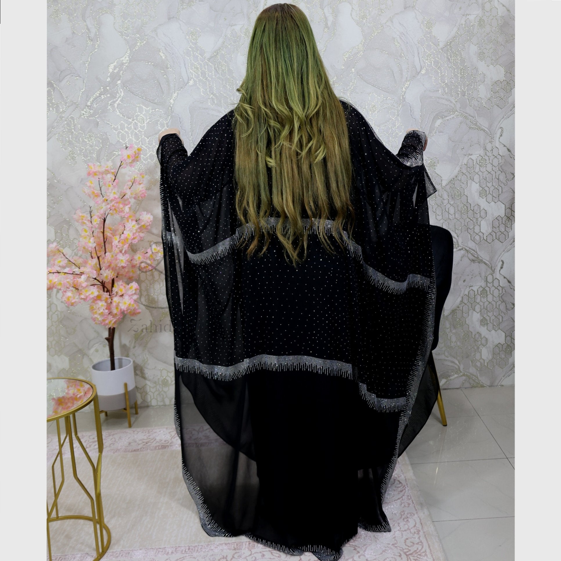 Bisht abaya in chiffon fabric Bahraini round cut with full stone work including sheila with stone work. To be wear on top of wedding dress or abaya.
