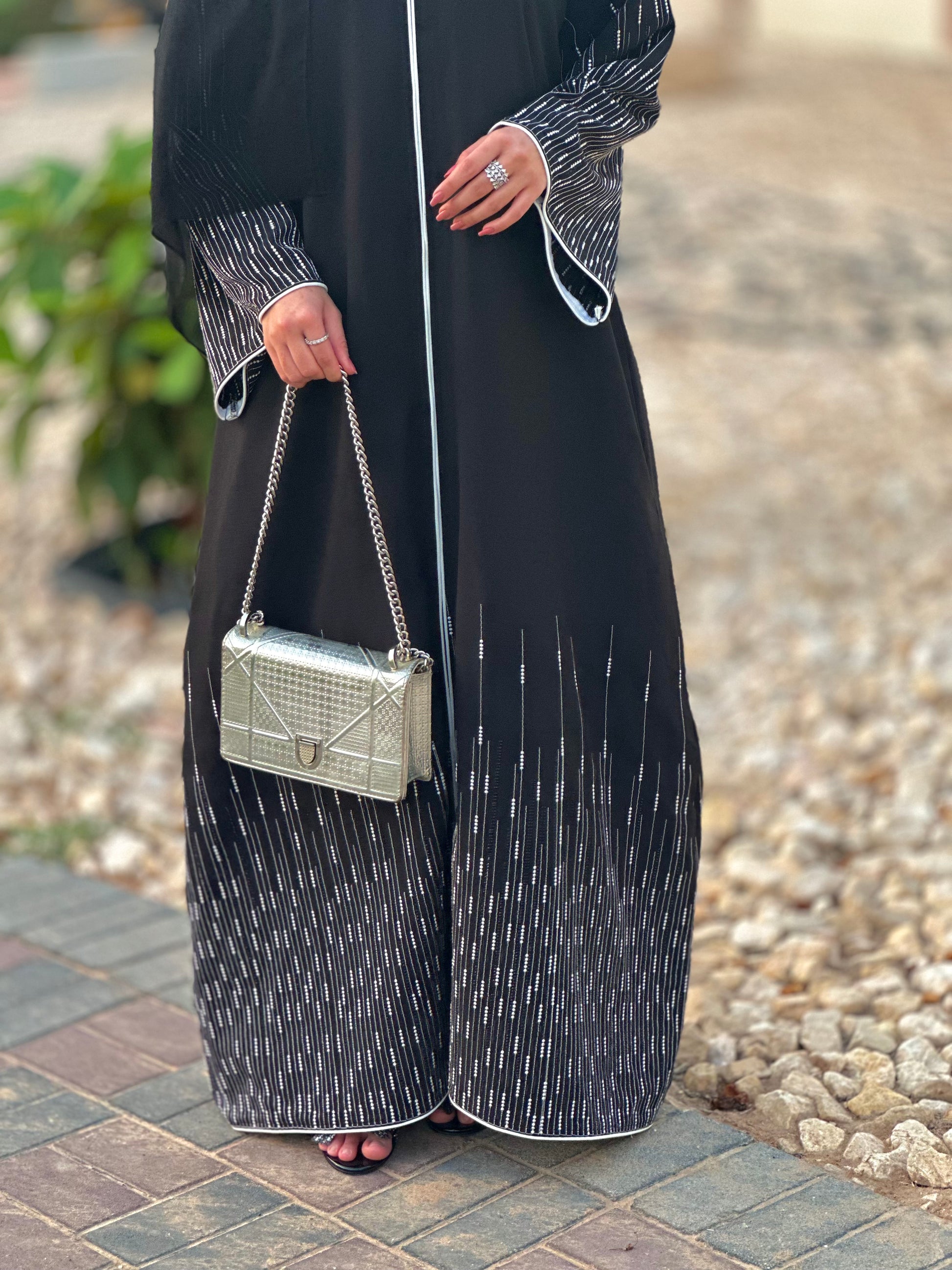 Elevate your wardrobe with our Black and White Embroidery and Stone Work Abaya. Made with luxurious crepe fabric, this abaya features intricate white embroidery and piping design, enhanced with a touch of stone work. Perfect for adding a glamorous touch to your outfit.