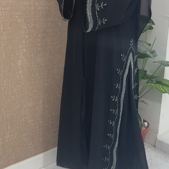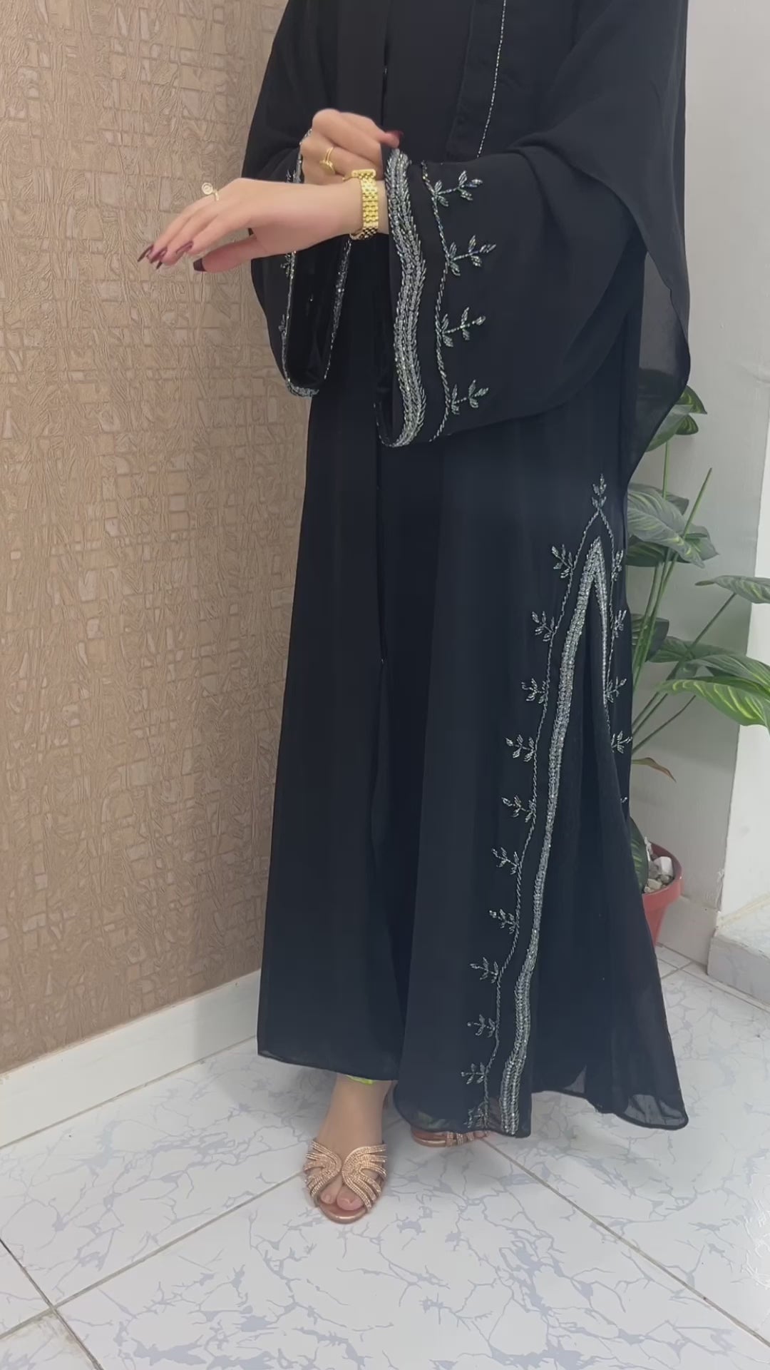 Experience luxury with our Chiffon Abaya, featuring a soft and comfortable lining for all-day wear. The elegant net side panels add a touch of sophistication and the delicate hand embroidery elevates the design. Stand out in style and comfort with our Chiffon Abaya.