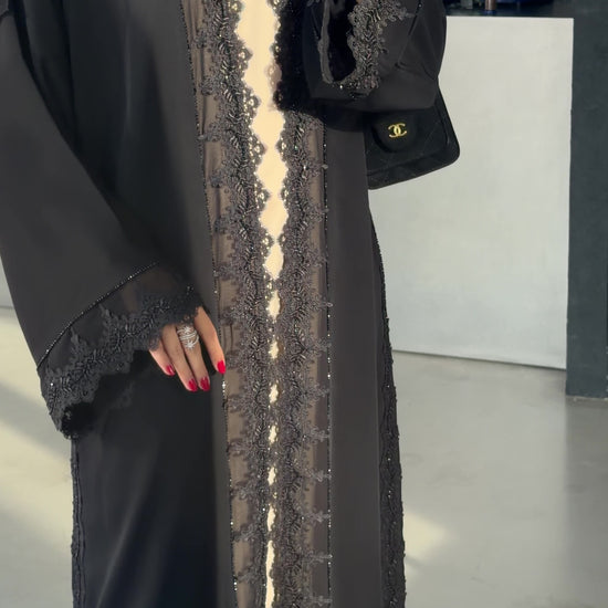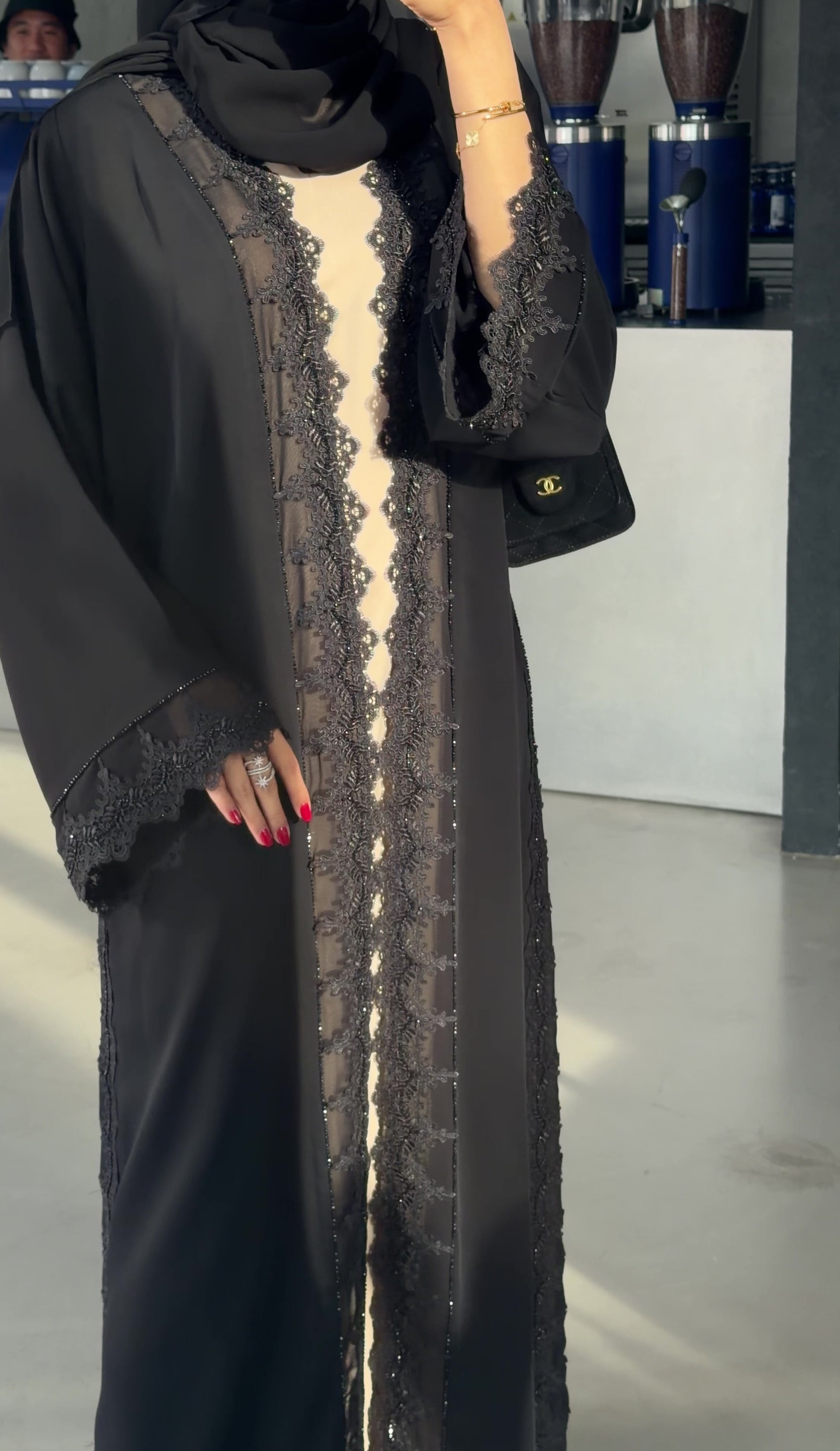 Introducing the latest collection of the Dantel Abaya, where exquisite craftsmanship meets refined elegance. Adorned with a unique dantel design and infused with delicate handwork, this piece transcends mere attire to become a statement of sophistication. Crafted from premium nada fabric, it embodies the quintessence of grace, making it an exceptional choice for Eid celebrations.