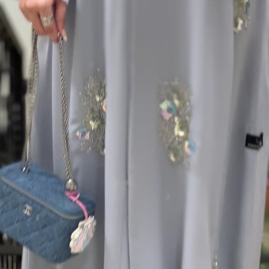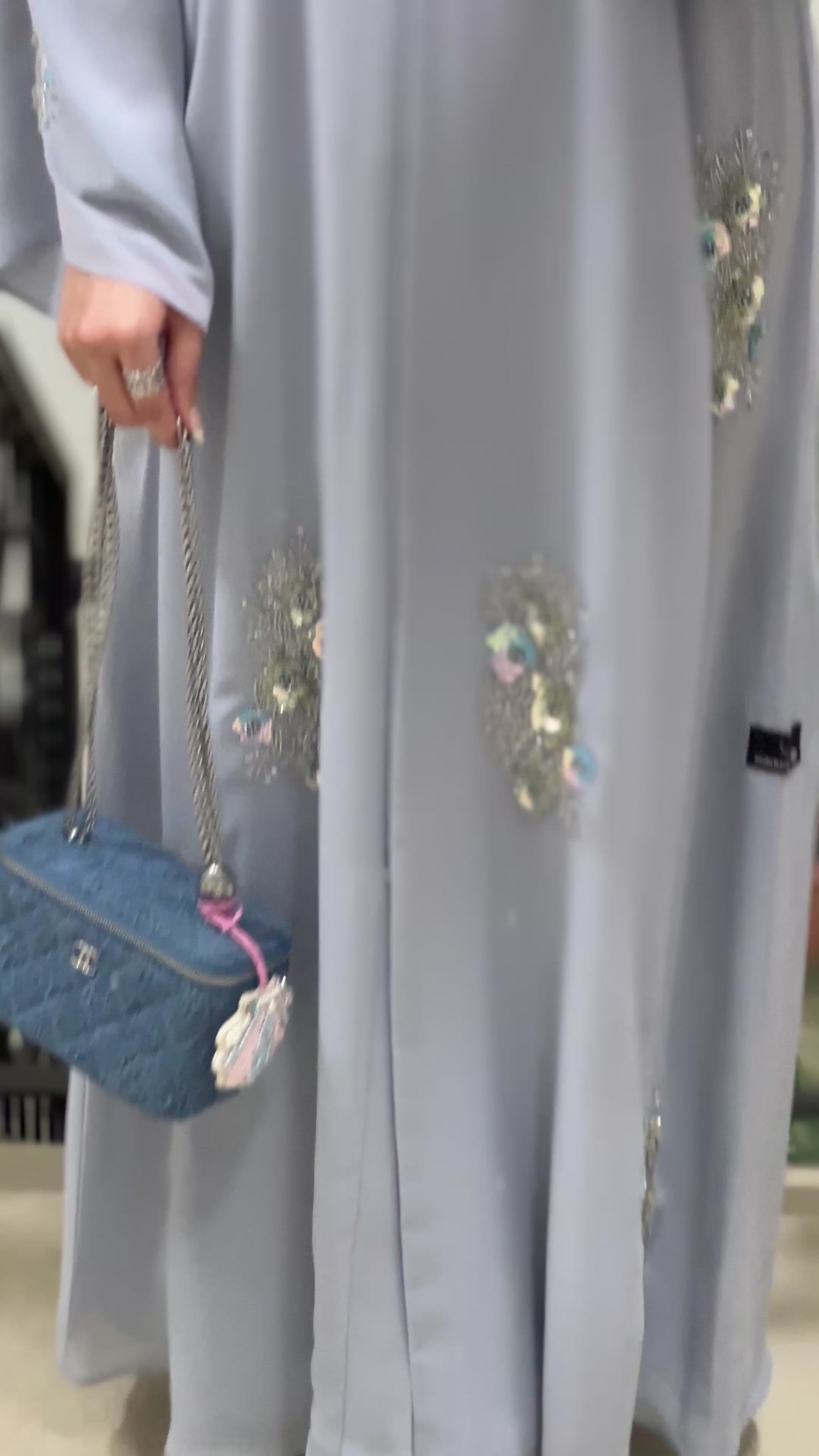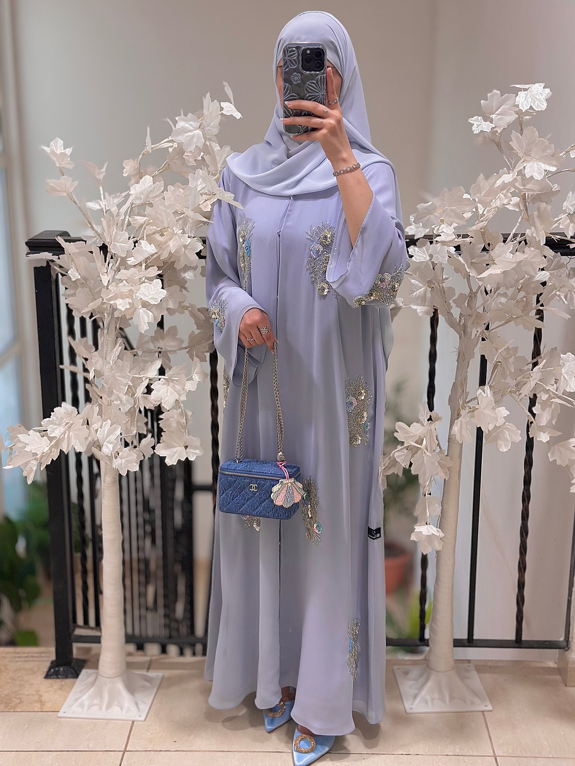 Indulge in luxury with our Graceful Blue Blossom Abaya. Crafted with double chiffon fabric and beautifully hand-embroidered floral designs, this abaya is perfect for any occasion. The soft pastel shade adds a touch of elegance to your wardrobe. Elevate your style with this exquisite piece.
