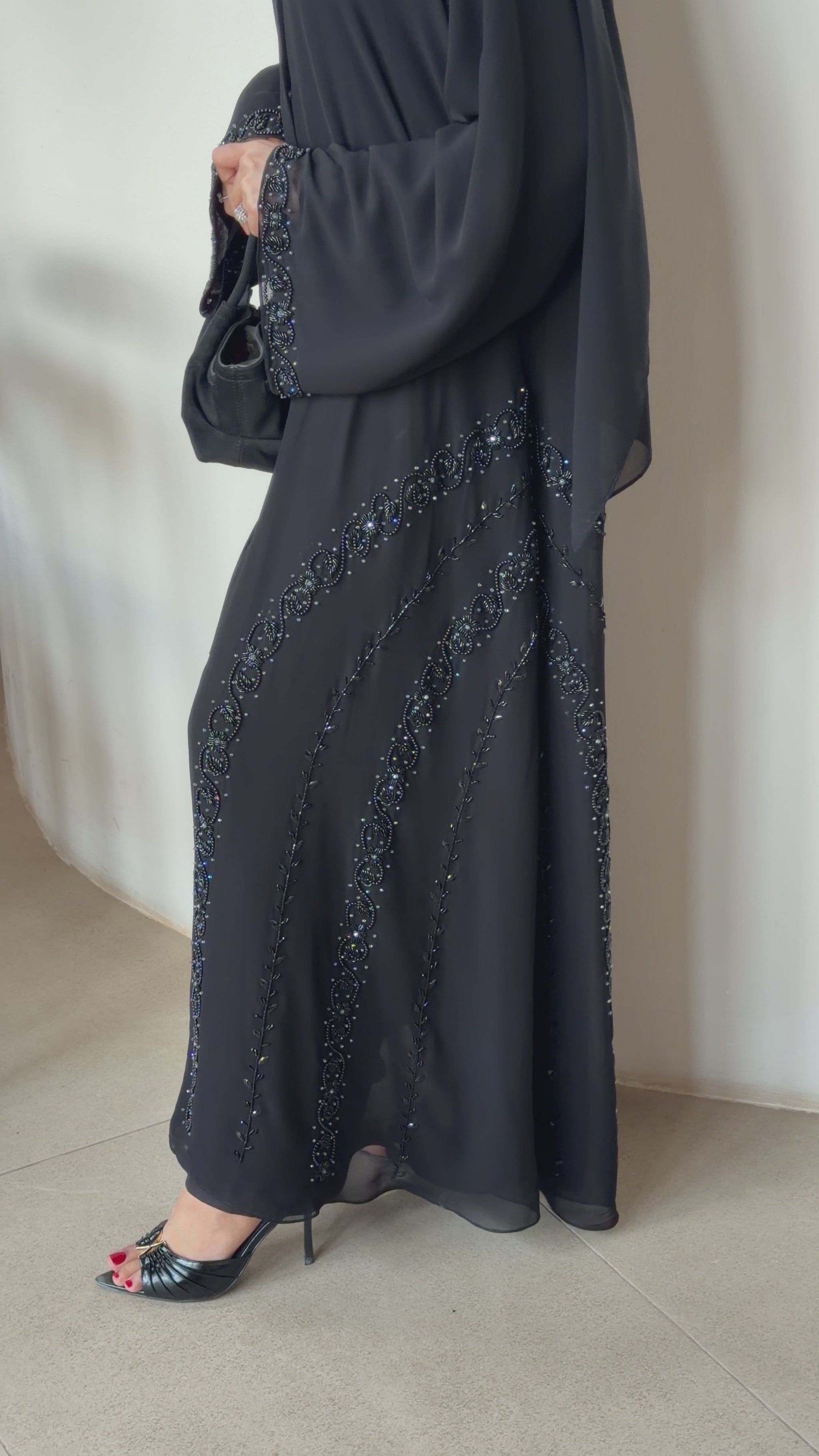 Expertly crafted in luxurious chiffon fabric, the Signature Luxury Occasion Zahidabi Abaya exudes elegance with its beautiful designs on both sides. Perfect for special occasions, this abaya combines comfort and style effortlessly. Elevate your wardrobe with this exquisite piece.
